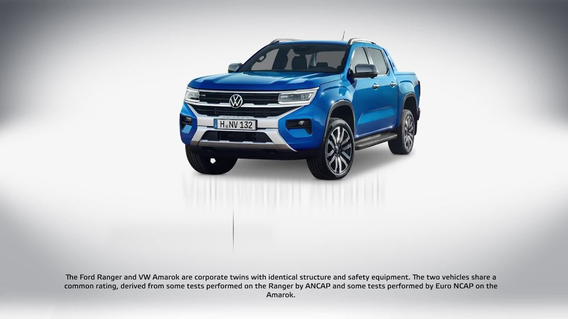The VW Amarok and Ford Ranger are corporate twins with identical structure and safety equipment. The two vehicles share a common rating, derived from some tests performed on the Ranger by ANCAP and some tests performed by Euro NCAP on the Amarok. Available content includes video of the VW Amarok and Ford Ranger, accompanied by still images and datasheet.