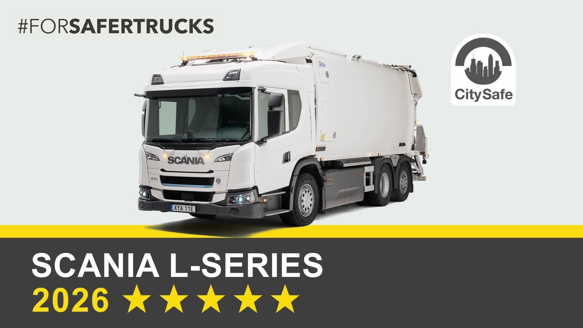 The Scania L-series can be a very safe choice for utility operations when specified with the correct optional equipment. In this case it was tested as a refuse collection vehicle. The L-series achieved a very good performance in both Safe Driving and Collision Avoidance, earning our CitySafe award alongside its 5 stars. It is available with all of the driver assistance systems Euro NCAP assess and they perform well to support from urban stop/start operations to highway driving. The low entry cab provides excellent direct vision. Whilst the conventional rear view mirrors can create localised blind areas, the camera monitor systems provide continuous views around the front nearside corner specifically and all around the vehicle generally. The Scania L-series is available with a top-performing AEB system for nearside turn collisions with cyclists which is especially important reflecting the likely use of this vehicle. The AEB system also performs well in frontal vehicle, pedestrian and cyclist scenarios. The vehicle tested was a battery electric variant, which complies with Euro NCAP's post crash safety requirements. Overall, the L-series can be a very safe vehicle for utility operations provided that the appropriate options are selected at purchase.